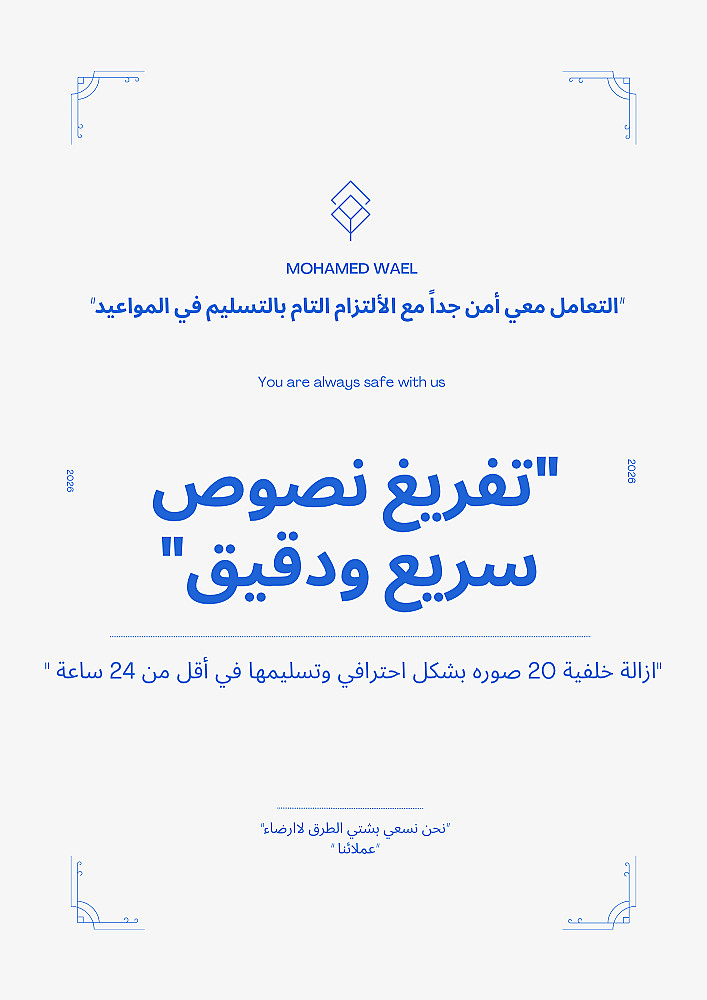 1: تفريغ ملفات (PDF) وصور ومقاطع صوتية إلى ملف Word بدقة وسرعة. 2:إزالة خلفية 20 صورة باحترافية عالية وتسليمها خلال 24 س