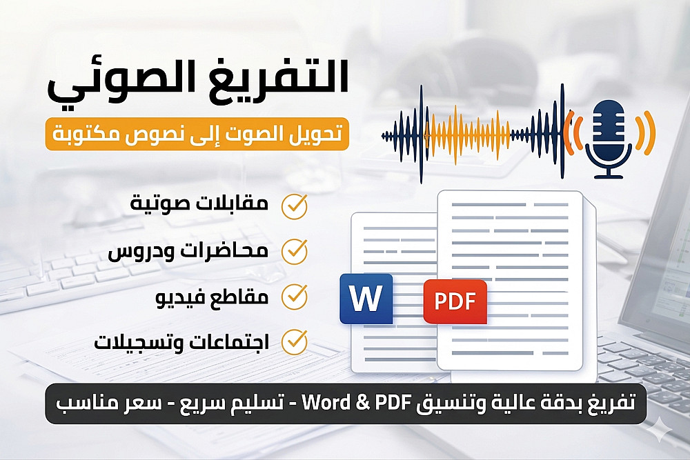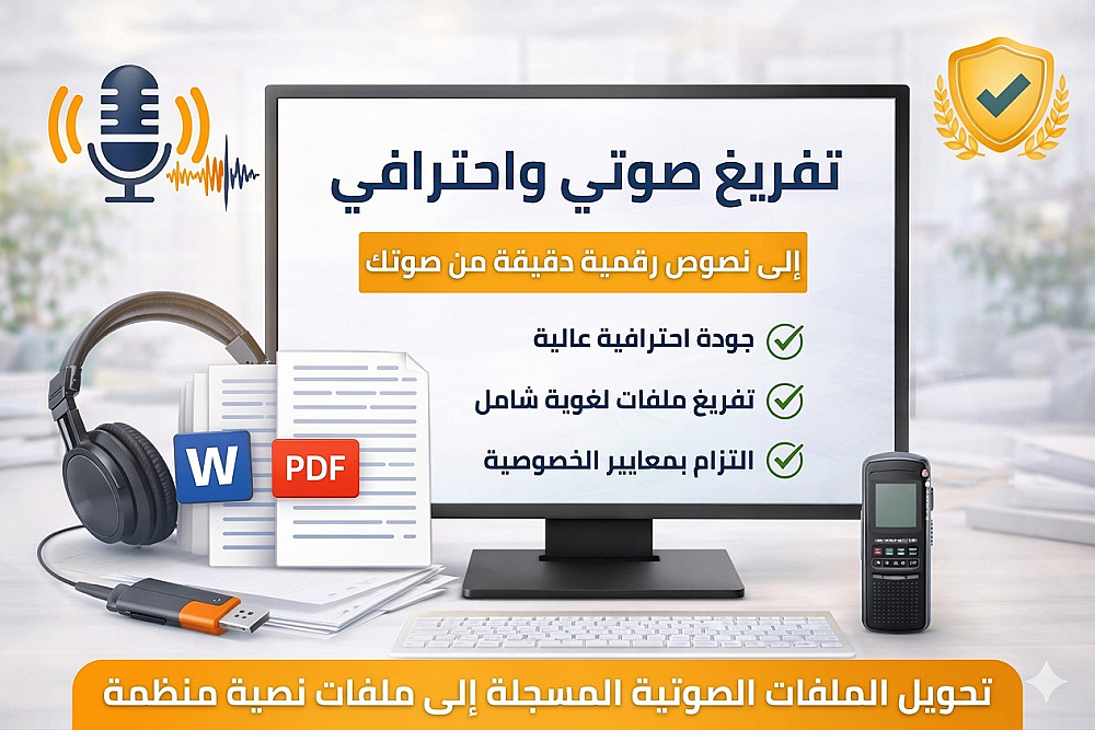 أقدم خدمة التفريغ الصوتي (Transcription) بدقة واحترافية عالية ((تفريغ احترافي لـ 15 دقيقة صوتية مقابل 5 دولار فقط،)) حيث أقوم بتحويل الملفات الصوتية أو مقاطع الفيديو إلى نص مكتوب بشكل منظم وواضح.