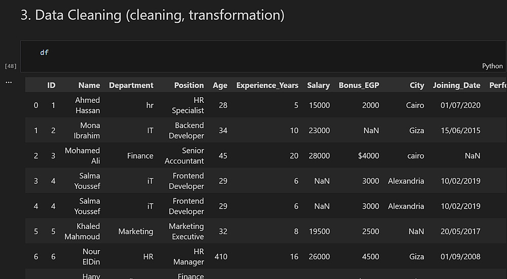 أصحح الأخطاء الموجودة في البيانات وأحول الأنواع (مثل تحويل النصوص إلى أرقام أو العكس) بشكل مناسب، لضمان أن كل عمود يعمل بالطريقة المطلوبة