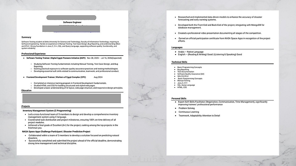 هل تُرفض سيرتك الذاتية آلياً قبل أن يراها المدير؟ المشكلة غالباً في عدم توافقها مع أنظمة الـ ATS. مقابل خدمة واحدة، سأقوم بتحويل سيرتك الذاتية (صفحة واحدة) إلى وثيقة ذكية تتجاوز فلاتر التوظيف وتبرز مهاراتك بلغة احترافية ودقيقة.