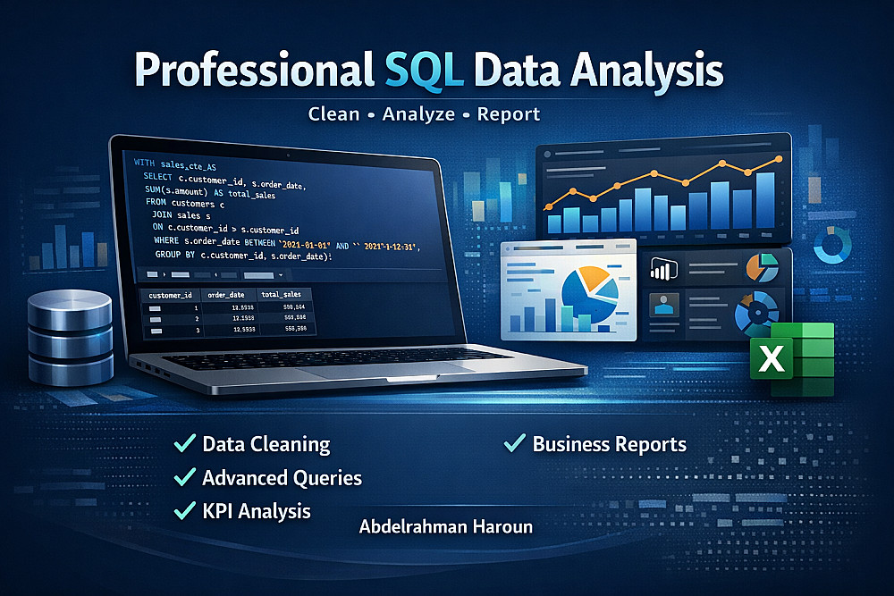 تحليل بيانات احترافي باستخدام SQL وإعداد تقارير أعمال متكاملة – استعلامات دقيقة، KPIs واضحة، ورؤى تدعم القرار