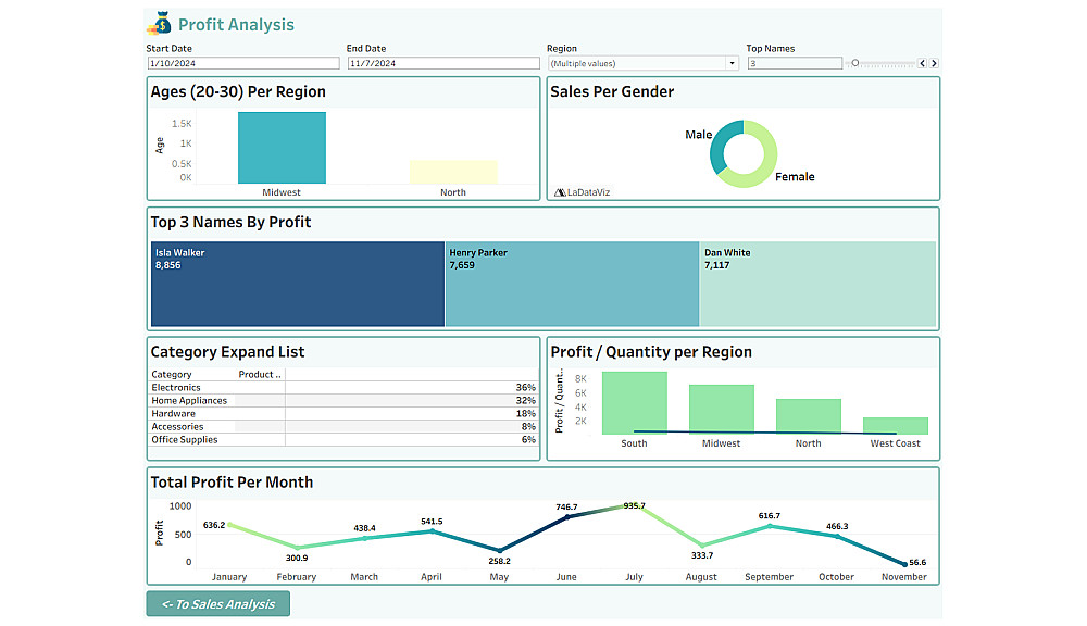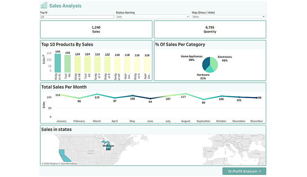 مشروع لوحة معلومات تفاعلية باستخدام Tableau يركز على تحليل المبيعات والأرباح بهدف تقديم رؤى واضحة مبنية على البيانات.