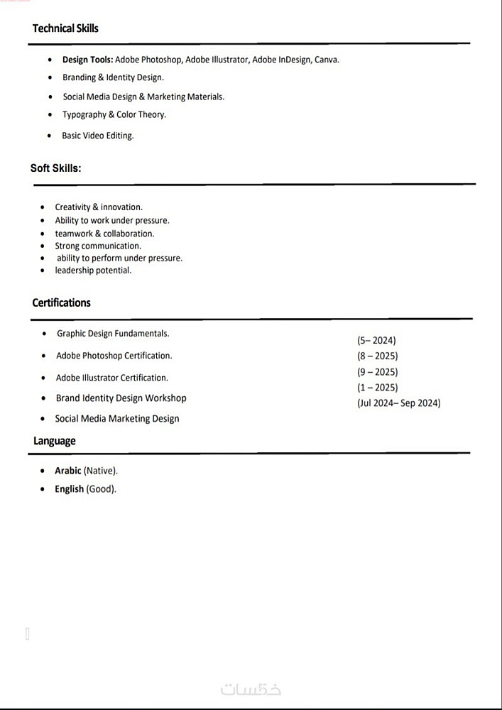 لذلك أقدم لك خدمة كتابة وتصميم سيرة ذاتية احترافية تُظهر قيمتك الفعلية وتقدّمك بصورة منظمة وجذابة، وفقًا لأحدث المعايير العالمية في إعداد الـCVs.