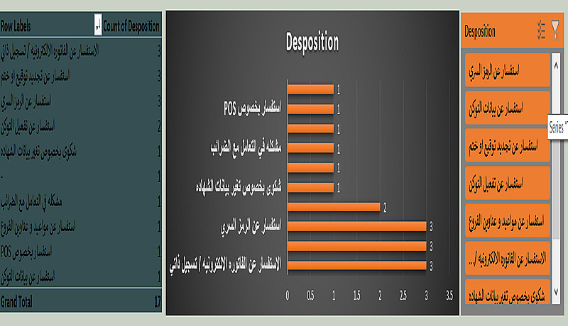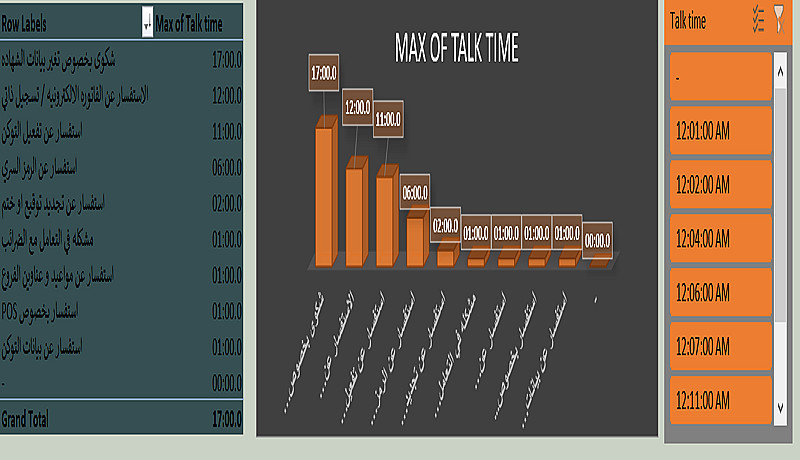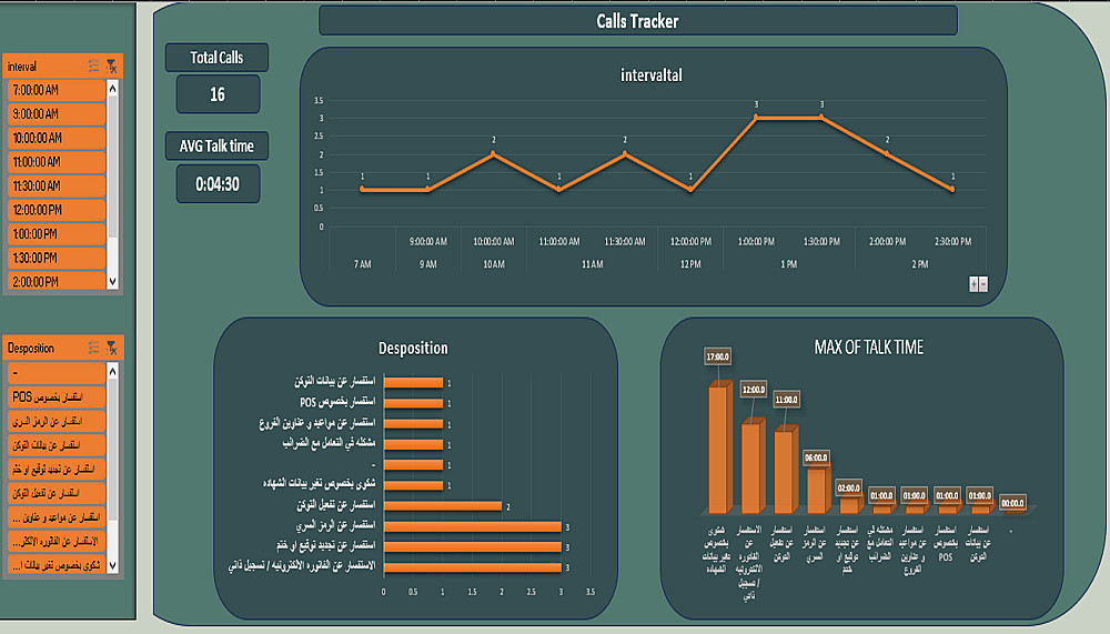 أقدّم لك لوحة تحكم ديناميكية لتحليل بيانات مركز الاتصال، توفّر رؤى واضحة تساعدك على متابعة الأداء واتخاذ قرارات تشغيلية مبنية على البيانات. يتم تصميم الداشبورد بشكل تفاعلي وسهل الاستخدام، مع عرض مؤشرات الأداء مثل حجم المكالمات، متوسط وقت التحدث، وأداء الموظفين من خلال تقارير ورسوم بيانية واضحة.