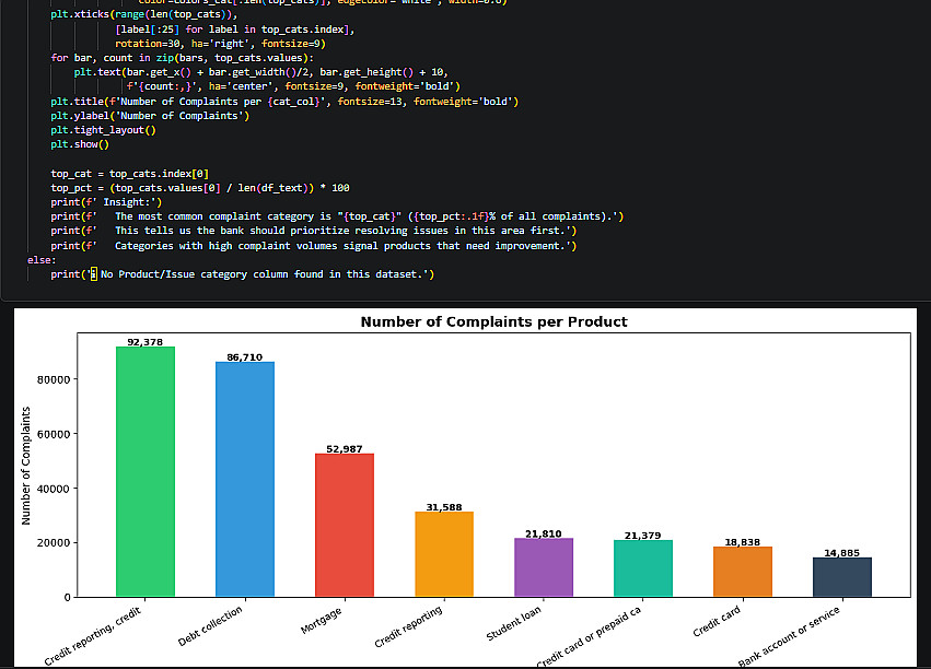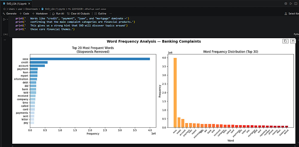 قمت بتنفيذ مشروع متكامل لتحليل شكاوى العملاء في القطاع البنكي باستخدام تقنيات تحليل النصوص (NLP). يشمل المشروع تنظيف البيانات النصية، تحليلها استكشافيًا (EDA)، واستخراج أهم الأنماط والكلمات المتكررة. تم تحويل النصوص إلى تمثيل رقمي باستخدام TF-IDF، ثم تطبيق خوارزمية SVD (LSA) لاكتشاف الموضوعات الخفية داخل الشكاوى. كما تم استخدام Cosine Similarity لقياس التشابه بين الشكاوى وتحليل العلاقات بينها. يساعد هذا المشروع الشركات على فهم مشاكل العملاء بشكل أعمق واتخاذ قرارات مبنية على البيانات.