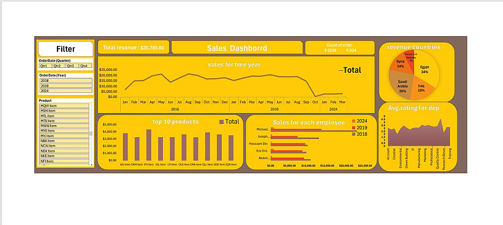 تحليل أداء المنتجات والموظفين: تحديد أفضل 10 منتجات مبيعاً ومقارنة أداء فريق المبيعات بالأرقام والنسب.