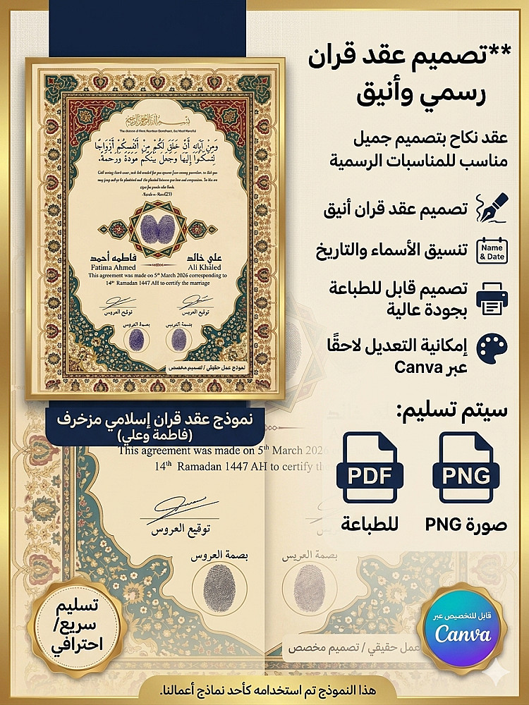 أصمم لك عقد قران أو عقد نكاح اسلامي بتصميم جميل ورسمي مناسب للمناسبات.