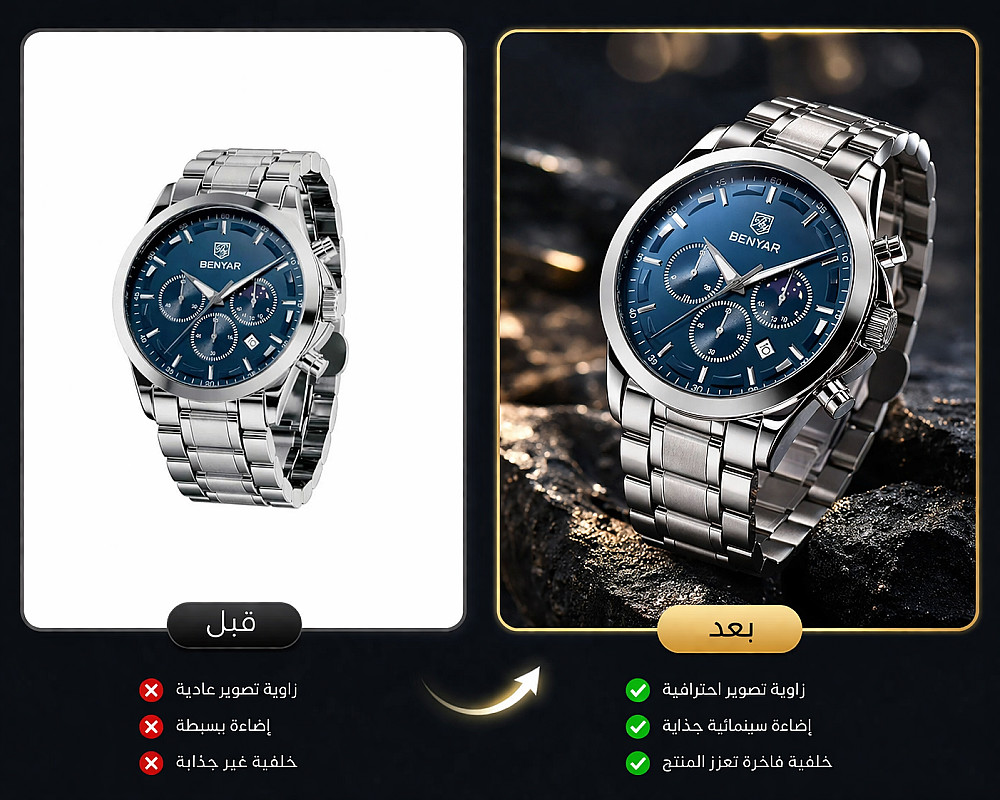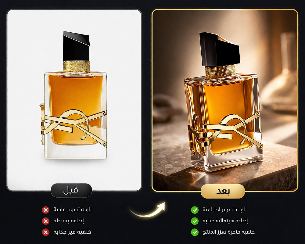 أقوم بتحويل صورك العادية إلى صور إعلانية جذابة باستخدام إضاءة احترافية وخلفيات مميزة تناسب البراند بتاعك.