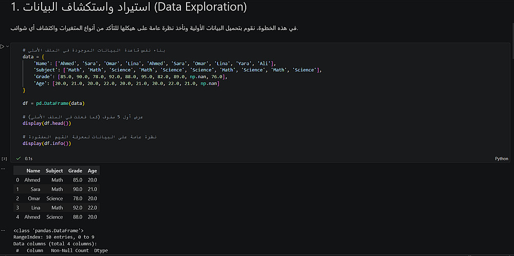 تنظيف البيانات (Data Cleaning): معالجة القيم المفقودة، إزالة التكرارات، وتصحيح أنواع البيانات لضمان دقة التحليل.