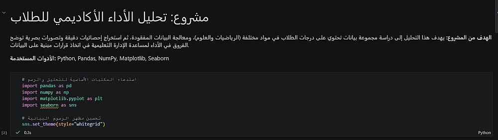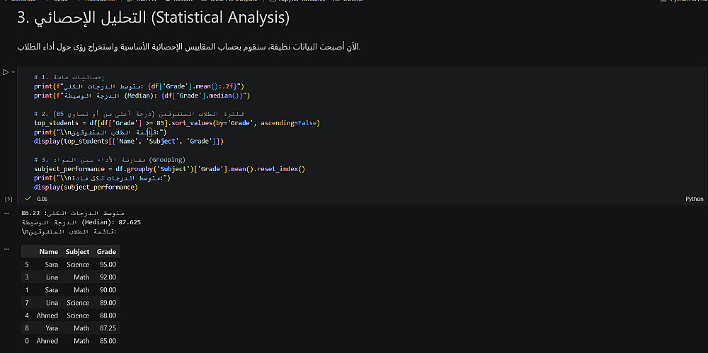 صيغة التسليم النهائي: تقرير بصيغة PDF يوضح الإحصائيات الأساسية والرسومات، أو ملف Jupyter Notebook (.ipynb) يحتوي على الكود نظيفاً وموثقاً.