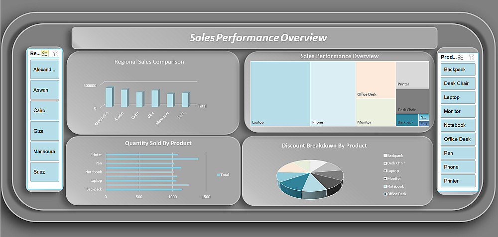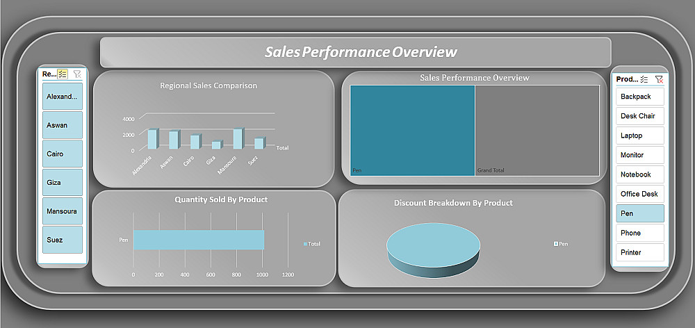 إضافة فلاتر ذكية (Slicers): تمكنك من تصفية البيانات (حسب التاريخ، المنطقة، المنتج، إلخ) بضغطة زر واحدة.
