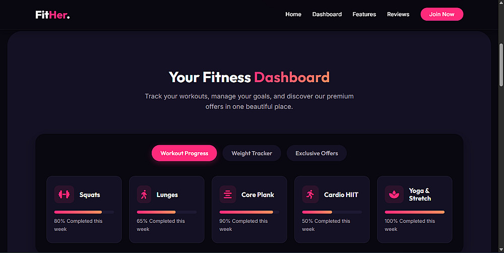 -نظام Tabs (مثل: التمارين – الوزن – العروض).