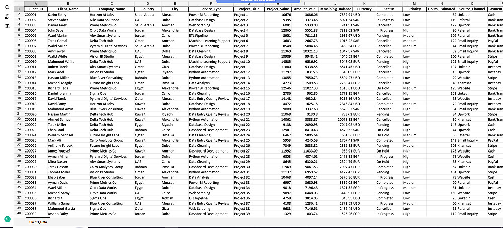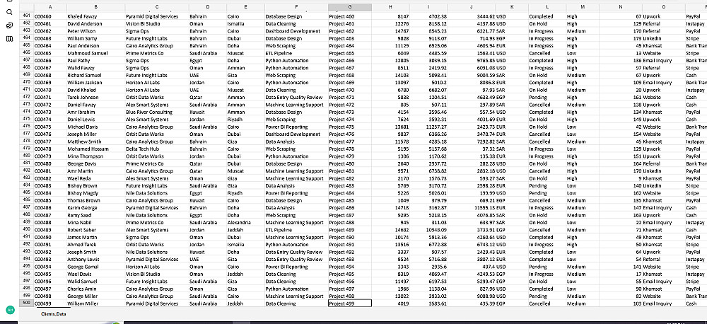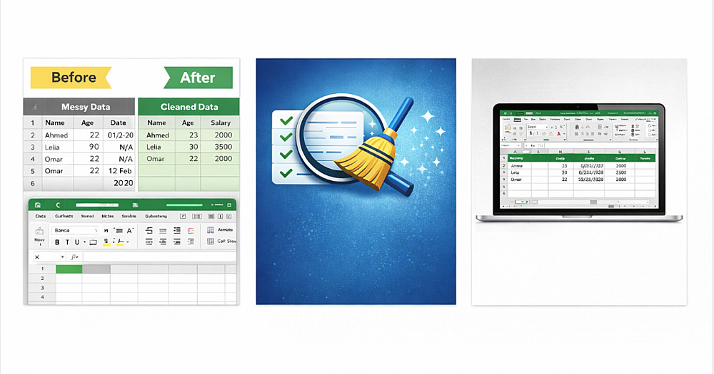 تشمل الخدمة معالجة الأخطاء الشائعة في البيانات، حذف التكرار، تنظيم الأعمدة، توحيد التنسيقات، والتأكد من أن البيانات أصبحت واضحة ومتسقة وقابلة للاستخدام بكفاءة.