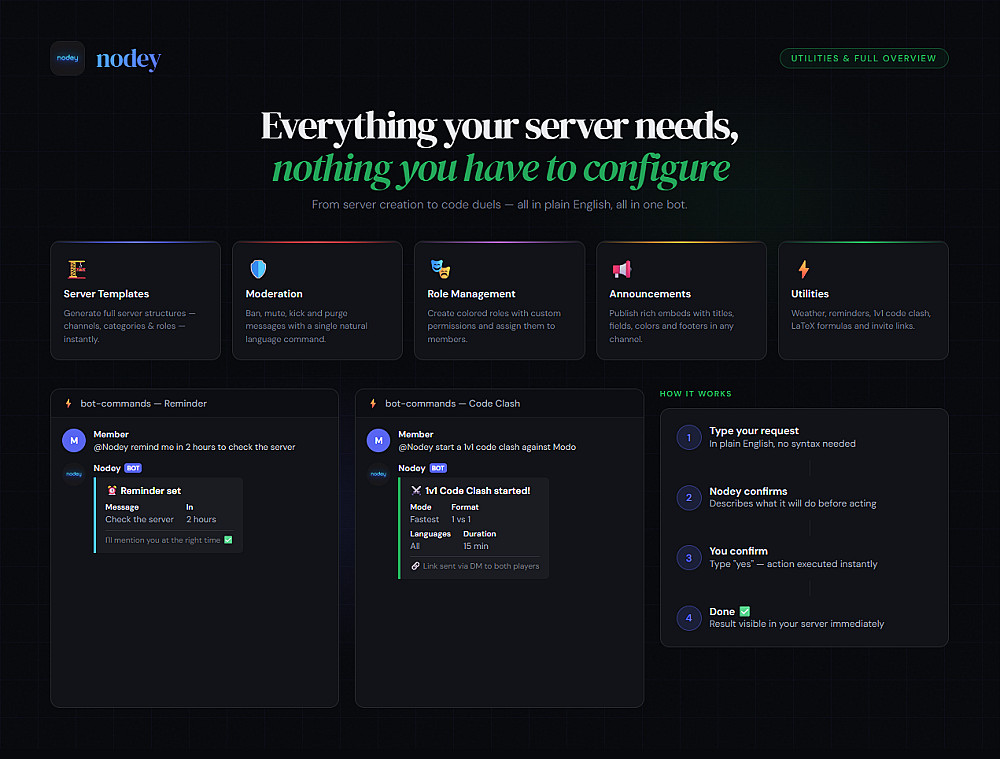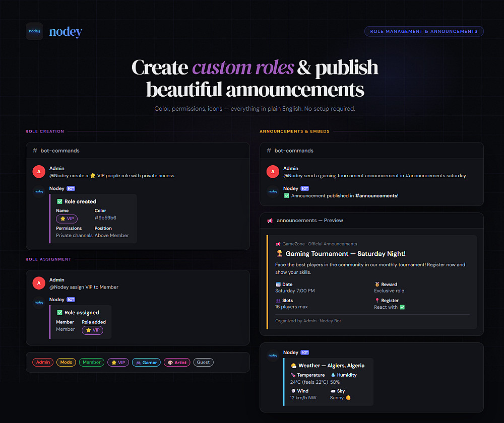 تجربة مستخدم متميزة (Premium UI/UX): وداعاً للنصوص المملة. أستخدم رسائل (Embeds) مخصصة وعالية الجودة للقوانين، الإعلانات، ولوحات المعلومات.