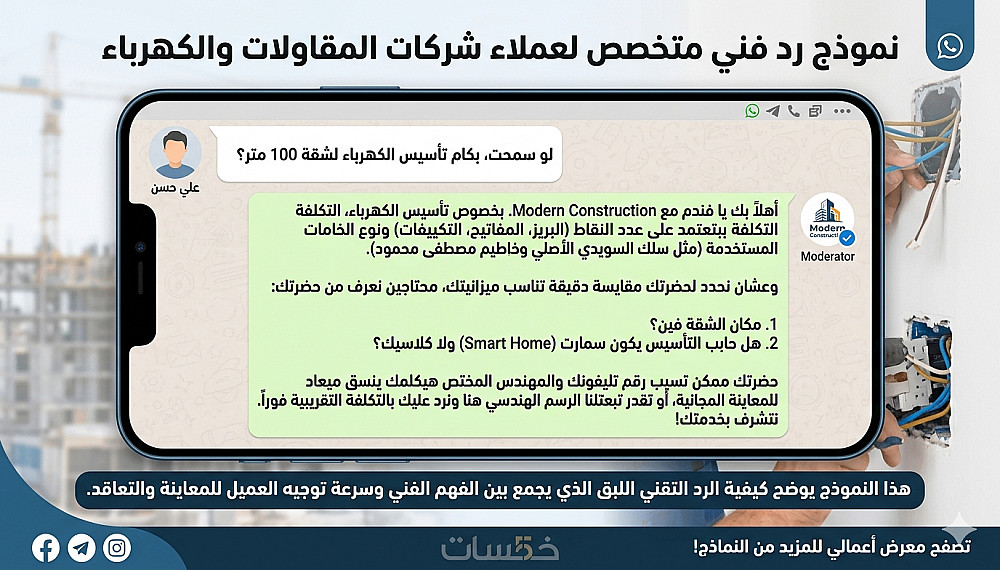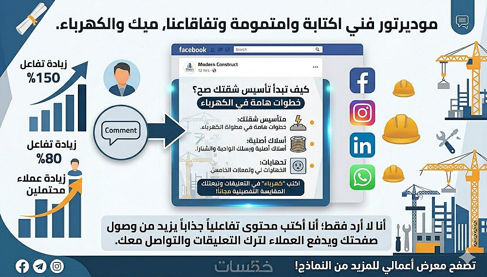 هل تبحث عن إدارة احترافية لصفحة شركتك (مقاولات، توريدات، كهرباء، تشطيبات)؟ بصفتي ممارساً في هذا القطاع، أقدم لك خدمة إدارة المحتوى والتفاعل التي تضمن لعملائك الرد الفني الدقيق والسريع.