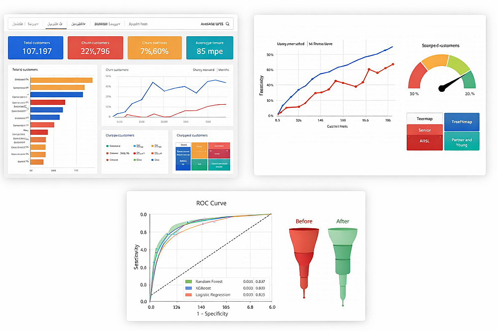أقوم ببناء نموذج متكامل باستخدام تعلم الآلة للتنبؤ بمغادرة العملاء (Churn Prediction) لمساعدتك في تقليل خسارة العملاء وزيادة الأرباح.