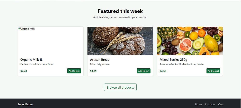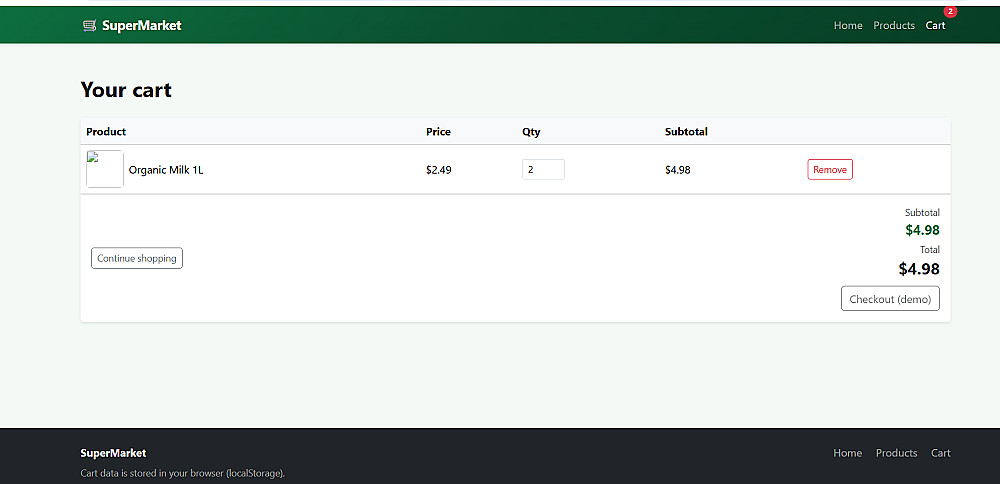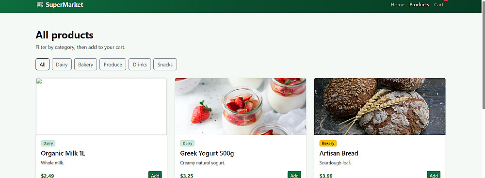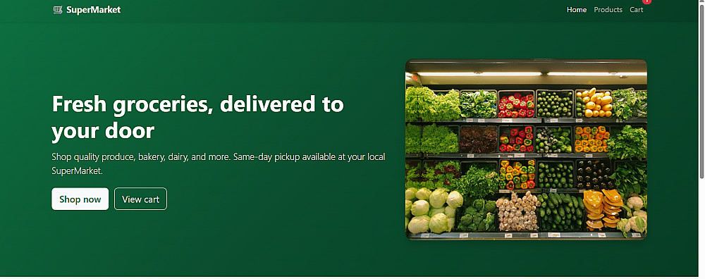 "SuperMarket" هو نموذج لمتجر إلكتروني عصري يركز على تقديم تجربة مستخدم بسيطة ومريحة. تم تصميم الواجهة لتكون جذابة بصرياً ومنظمة بحيث تسهل على العميل الوصول لما يريده بسرعة.