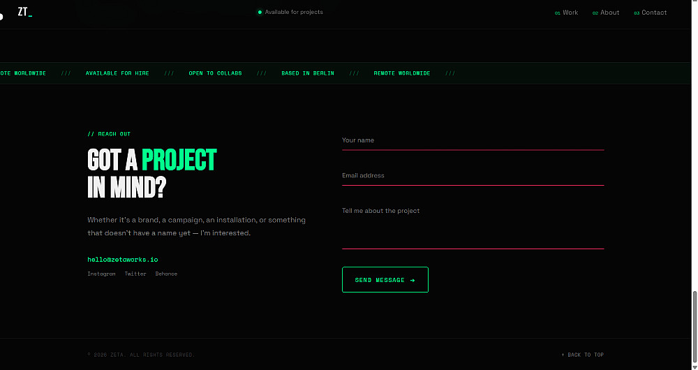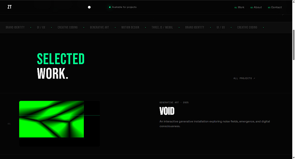 يتميز هذا العمل بتصميم إبداعي جريء يعتمد على خلفية سوداء مع لون نيون أخضر كأكسنت أساسي، مما يمنحه طابع Glitch وCyberpunk فريد من نوعه. تحتوي الخلفية على رسوم متحركة حية بالكانفاس تشمل جسيمات ضوئية وخطوط متحركة، فيما تعرض بطاقات المشاريع لوحات فنية توليدية حية مختلفة في كل بطاقة. العناوين تتفكك وتعود بحروف عشوائية عند التحميل أو التحويم مما يخلق تأثير Scramble مبهر، ويرافق ذلك مؤشر فأرة مخصص يتوسع ويتحول عند التحويم على المشاريع. يتضمن الموقع تأثير Parallax احترافي عند التمرير، ونموذج تواصل بتصميم عصري يعتمد Labels عائمة مع تحقق كامل من المدخلات. الكود مبني بـ HTML + CSS + JavaScript خالص دون أي مكتبات ثقيلة مما يضمن سرعة تحميل عالية، والموقع متجاوب بالكامل مع جميع الأجهزة وجاهز للرفع فوراً على أي استضافة.
