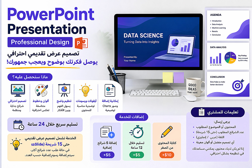 🔹 الخدمة تشمل تصميم عرض تقديمي احترافي حتى 15 شريحة