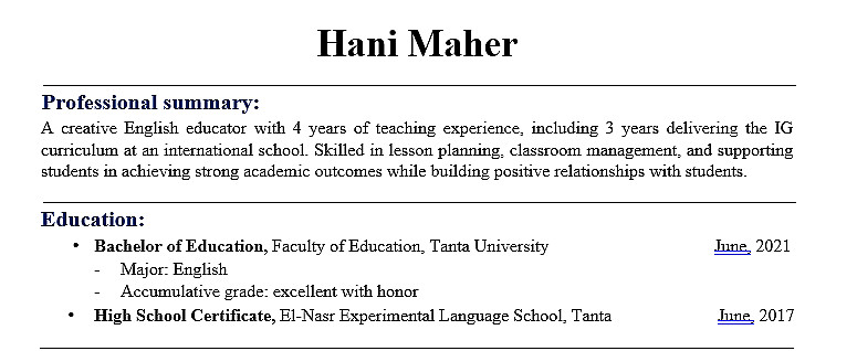 - تنظيم الأقسام (التعليم، الخبرات العملية، المهارات، الإنجازات) بشكل واضح ومرتب.
