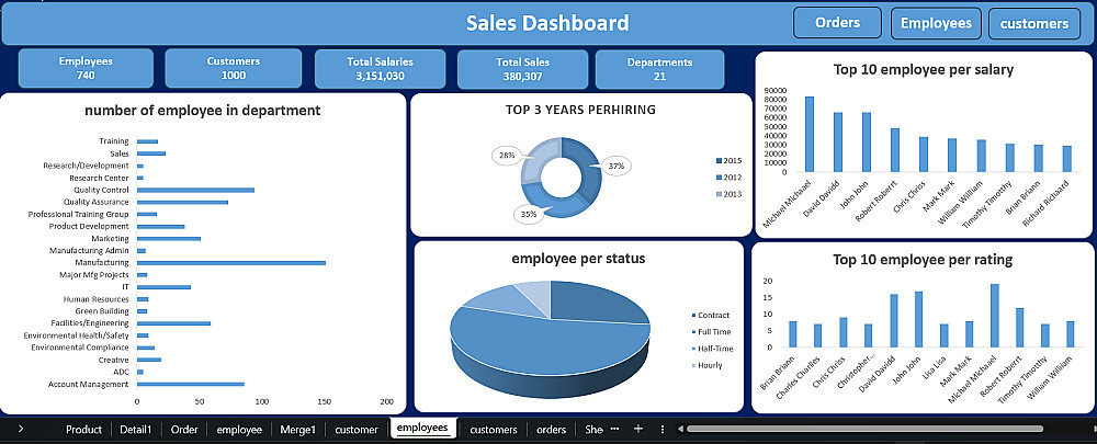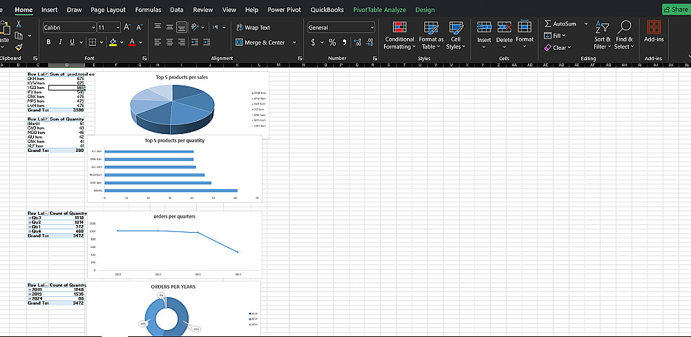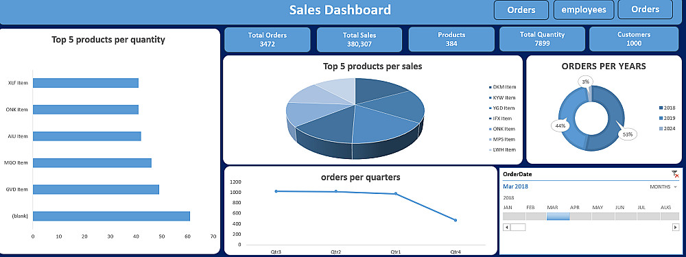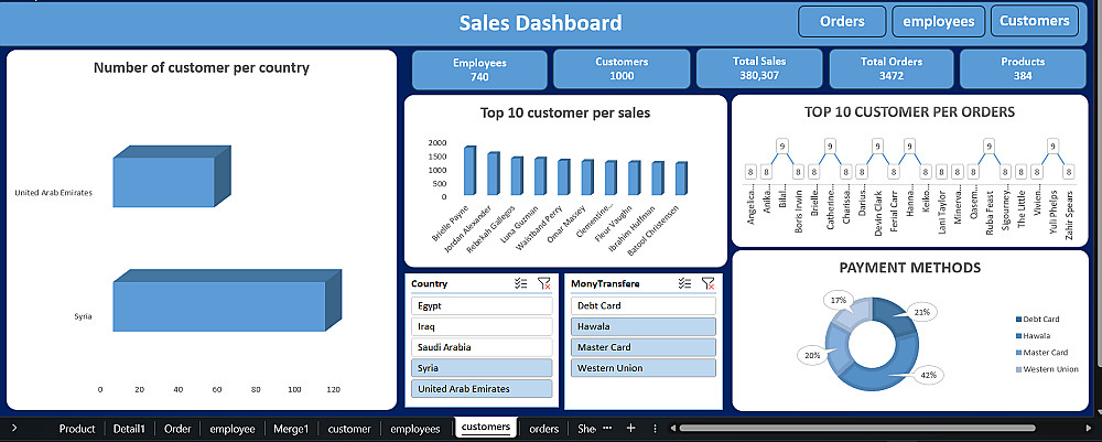 تصميم رسوم بيانية ذكية توضح أفضل المنتجات وأداء الموظفين مع "فلاتر زمنية" لتحديث الأرقام بمجرد الضغط على السنة أو الشهر و تنظيم وتنسيق جداول البيانات وعرض أهم المؤشرات (إجمالي المبيعات، عدد الطلبات، والعملاء) بشكل بصري جذاب وسهل الفهم.