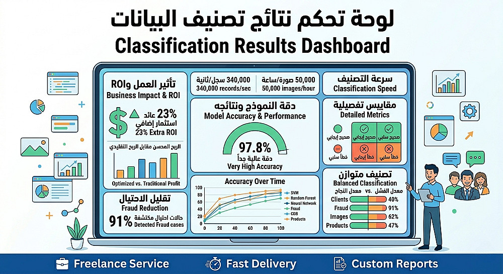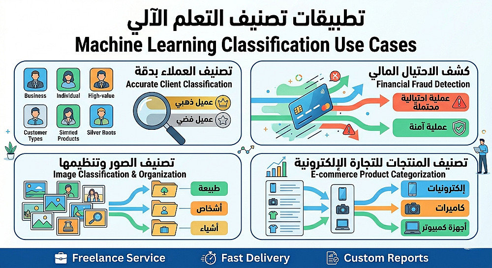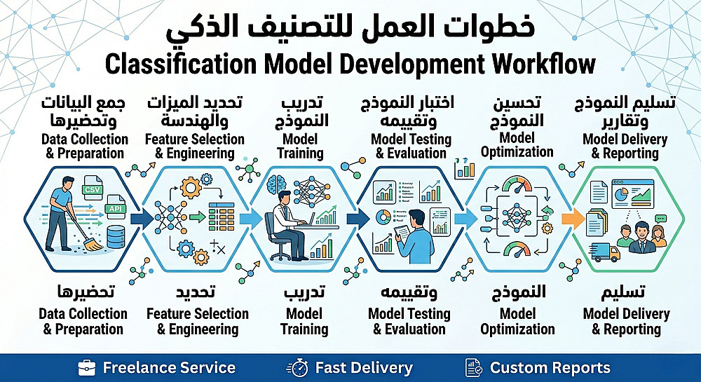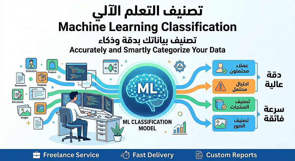 سأقوم بتطوير نموذج تعلم آلة لتصنيف البيانات إلى فئات مختلفة باستخدام خوارزميات مثل Logistic Regression وDecision Tree وRandom Forest.