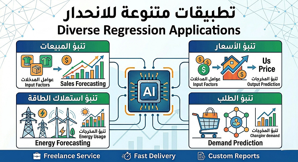 يمكن استخدام النموذج في تطبيقات متعددة مثل توقع الأسعار، المبيعات، أو أي قيم رقمية أخرى باستخدام خوارزميات متقدمة مثل Linear Regression وRidge وLasso وRandom Forest Regressor.