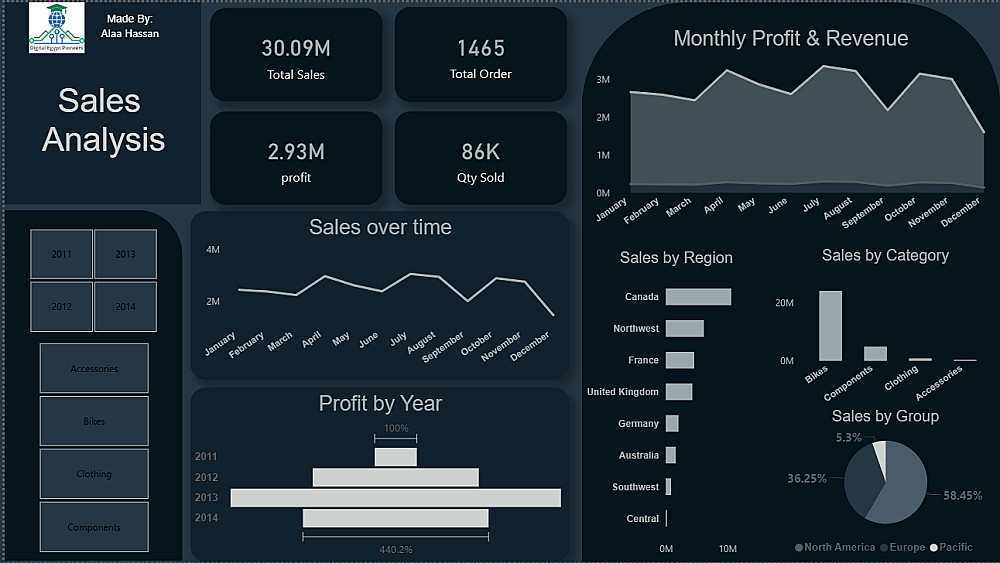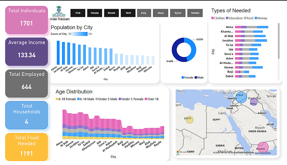 -بناء التقارير والرسوم البيانية: تصميم لوحة تحكم (Dashboard) من صفحة واحدة، تحتوي على 5 إلى 7 رسوم بيانية تفاعلية مصممة بعناية لتوضيح النتائج.