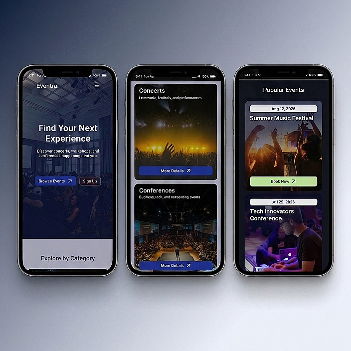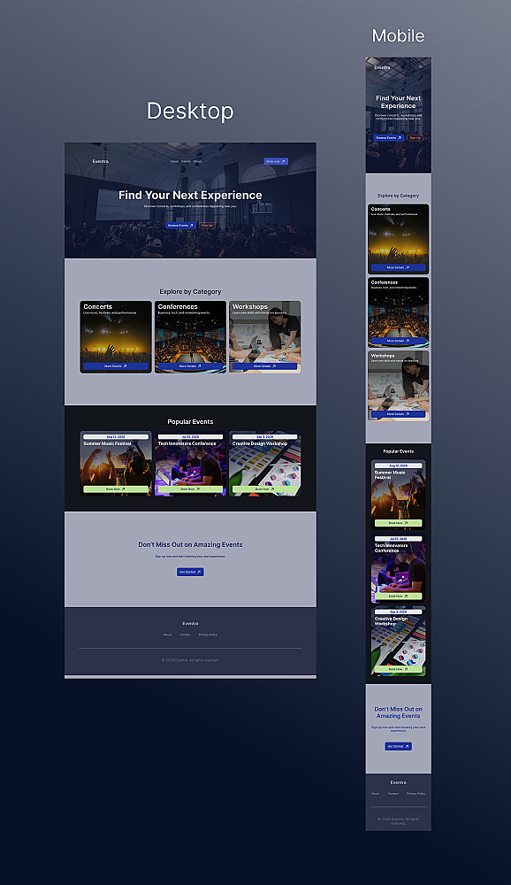 قمت بتصميم صفحة هبوط لمنصة حجز فعاليات (Events Platform)، ويمكنني مشاركة نموذج من العمل للاطلاع عليه قبل بدء التنفيذ.