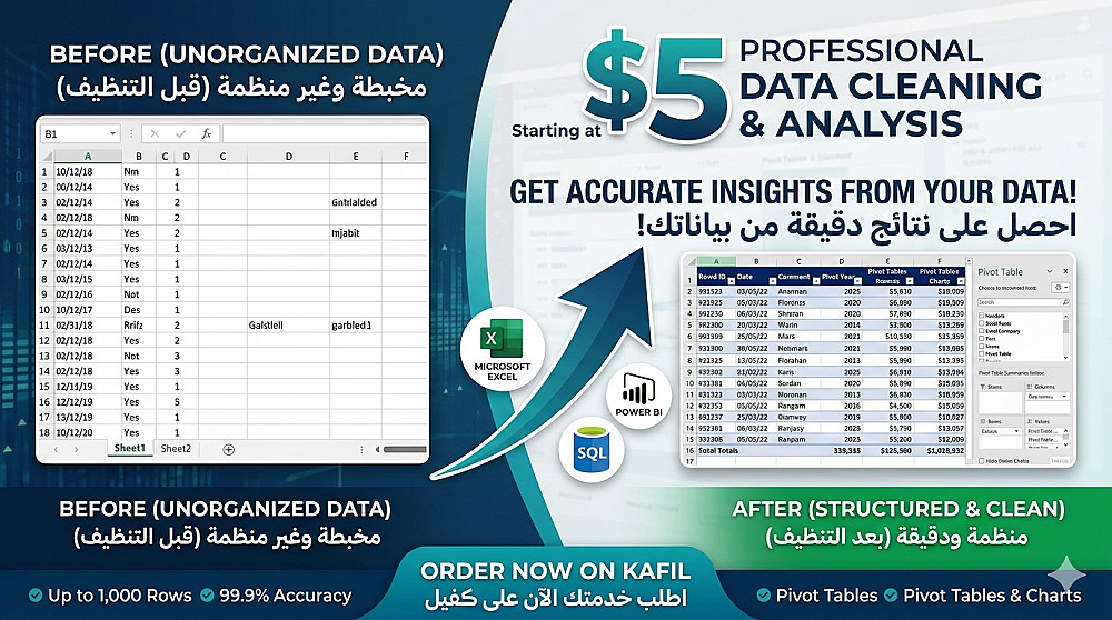 البيانات غير المنظمة تؤدي إلى قرارات خاطئة. إذا كان لديك ملف إكسل مليء بالأخطاء أو غير مرتب، فأنا هنا لتحويله إلى ملف منظم، دقيق، وجاهز للاستخدام مباشرة.