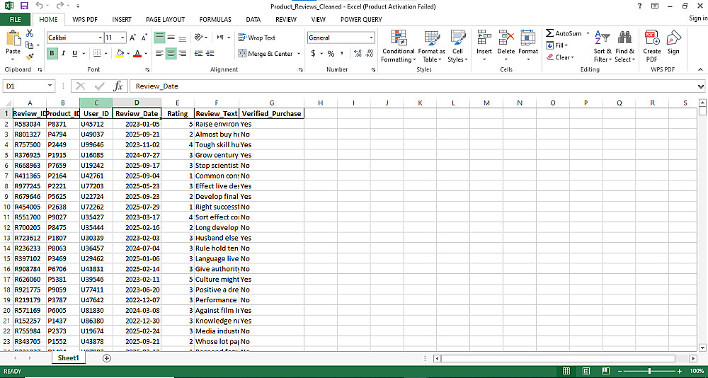 هيكلة الأعمدة: حذف الأعمدة غير الضرورية وتوحيد صيغ التاريخ (Review Date) وصيغ الأرقام لتسهيل التعامل معها برمجياً