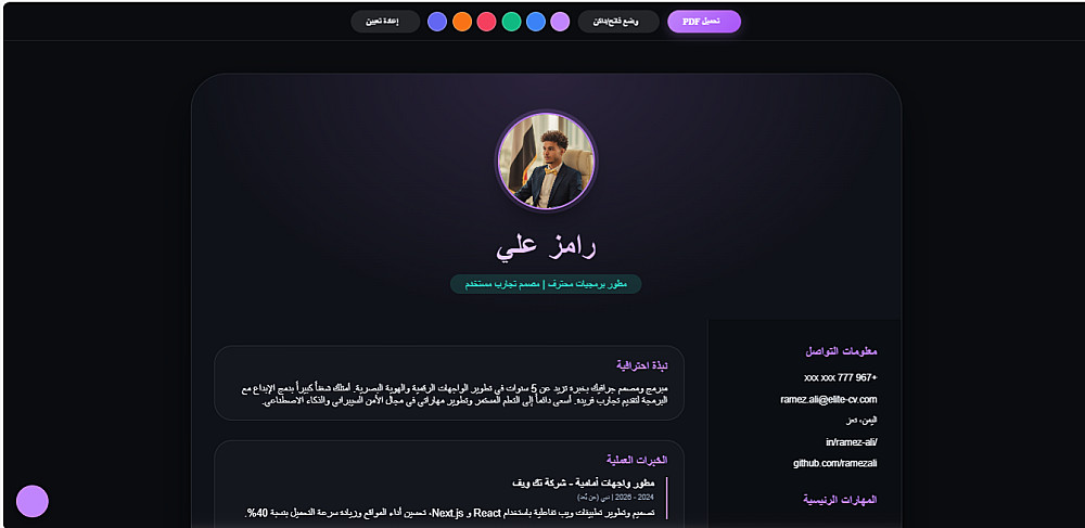 أقدم لك قالب Elite Pro CV، المصمم بأحدث تقنيات الويب (Glassmorphism) ليعطيك مظهراً تقنياً واحترافياً لا يُنسى.