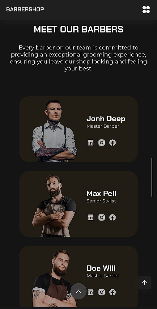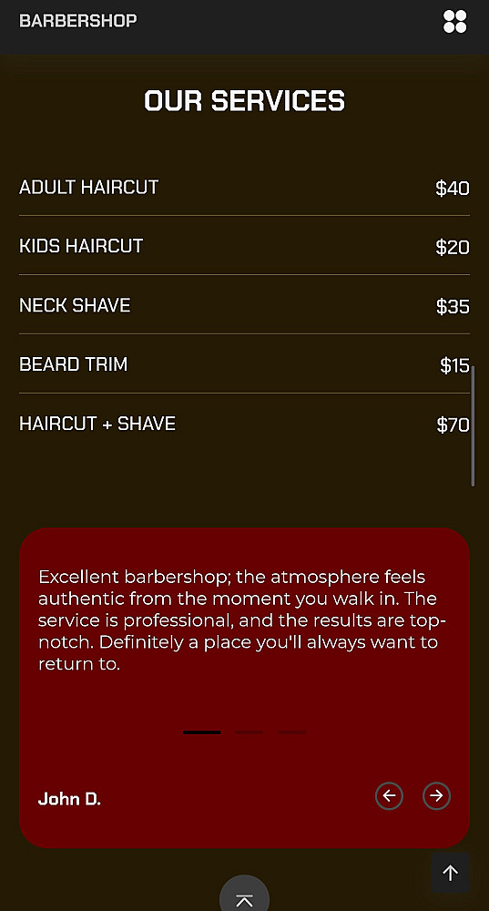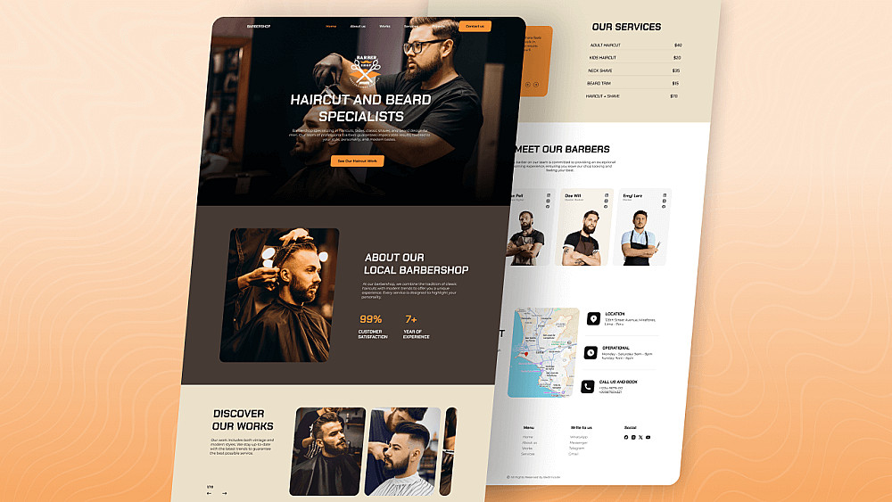 أقدم لك موقعاً إلكترونياً متكاملاً وعصرياً مخصصاً لصالونات الحلاقة الرجالية، يجمع بين التصميم الكلاسيكي الفاخر والتقنيات البرمجية الحديثة، ليمنح زبائنك تجربة مستخدم فريدة تليق بمهنيتك.