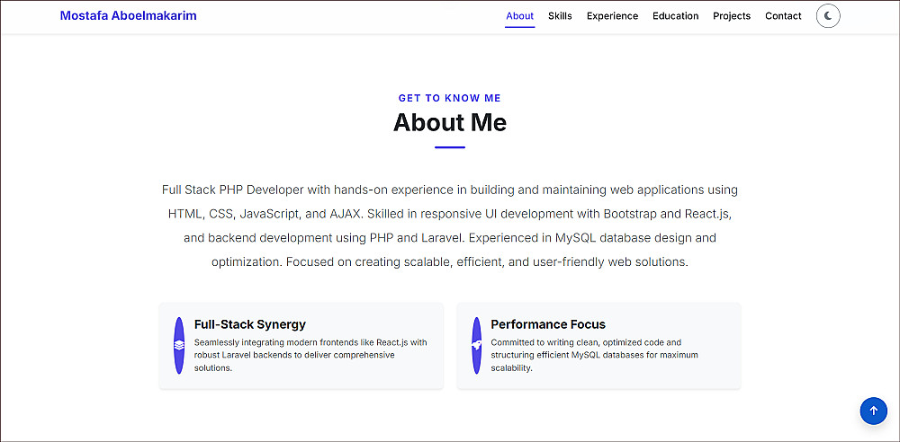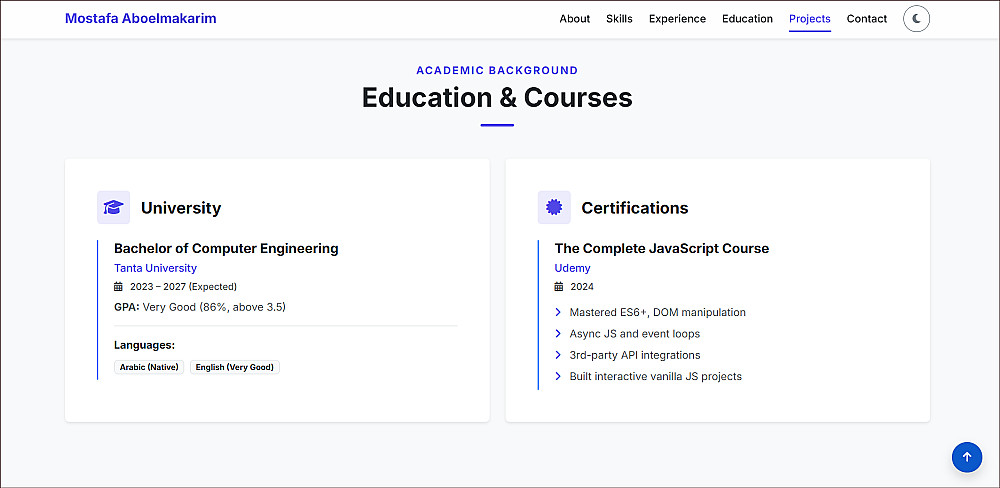 أقدّم لك خدمة تصميم وتطوير Portfolio عصري، سريع، ومتجاوب بالكامل مع جميع الأجهزة، يعتمد على أحدث أساليب التصميم ويركّز على إبراز أعمالك بشكل منظم واحترافي، مما يساعدك على الحصول على فرص عمل ومشاريع بشكل أفضل.