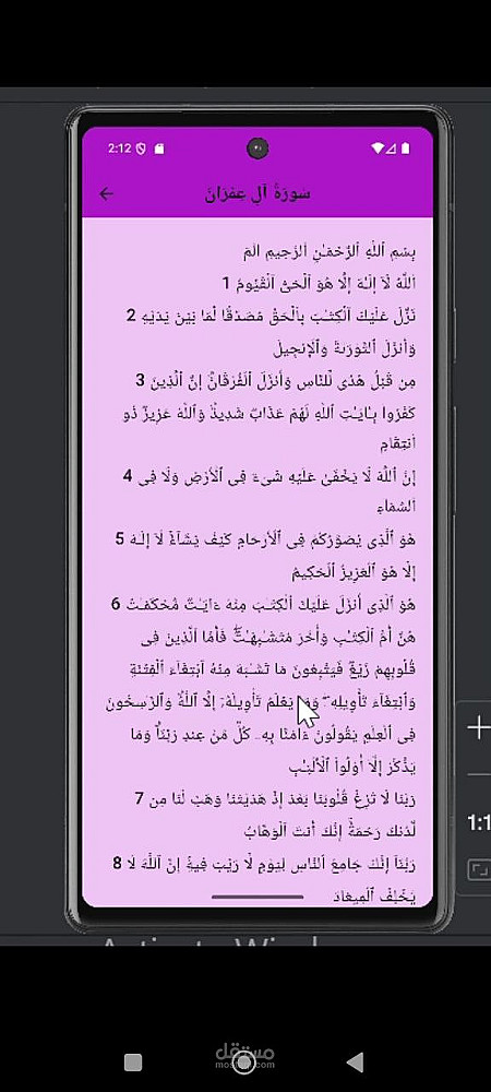 عرض الآيات: واجهة مخصصة لقراءة الآيات الكريمة بخطوط واضحة وتصميم مريح للعين يدعم القراءة الطويلة.