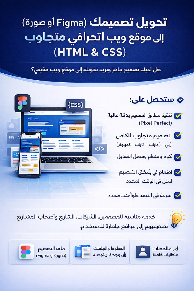 أقدم لك خدمة تحويل تصميمك من Figma أو أي صورة إلى كود HTML & CSS نظيف واحترافي، مع الالتزام الكامل بكل تفاصيل التصميم (Pixel Perfect).