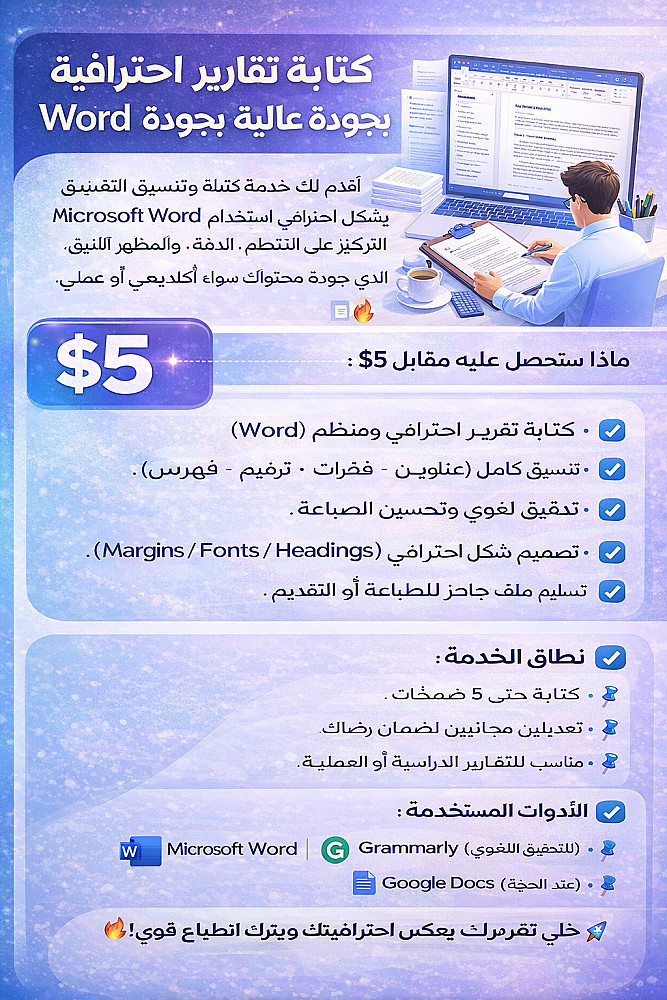 أقدّم لك خدمة كتابة وتنسيق التقارير بشكل احترافي باستخدام Microsoft Word، مع التركيز على التنظيم، الدقة، والمظهر الأنيق الذي يعكس جودة محتواك سواء كان أكاديمي أو عملي. 📄🔥