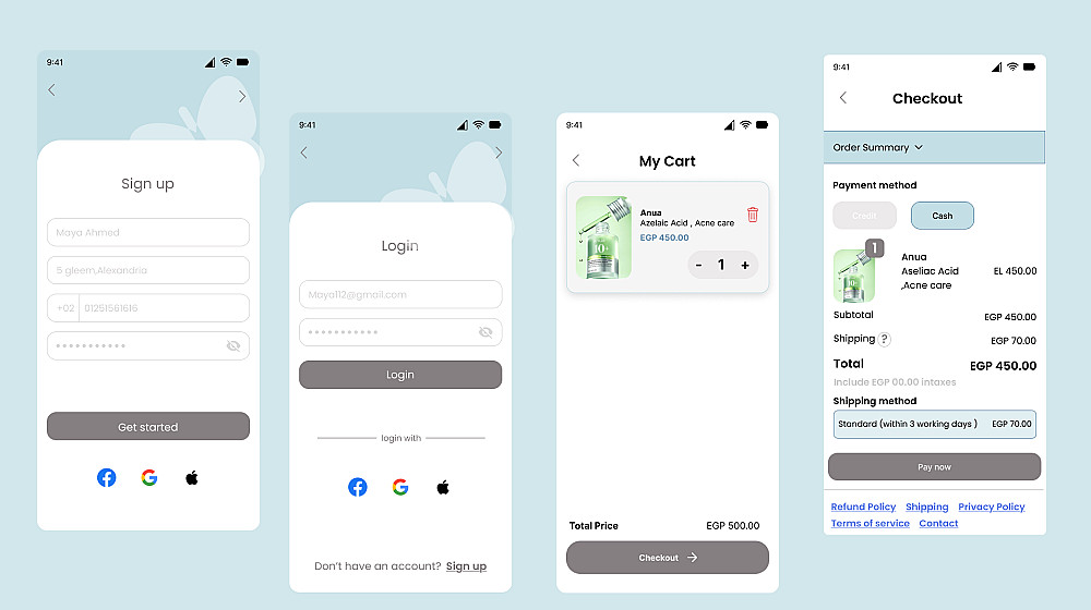 تصميم 3 شاشات تطبيق موبايل احترافية (UI) مثل ( Product details - Checkout - Sign in / Sign up )
