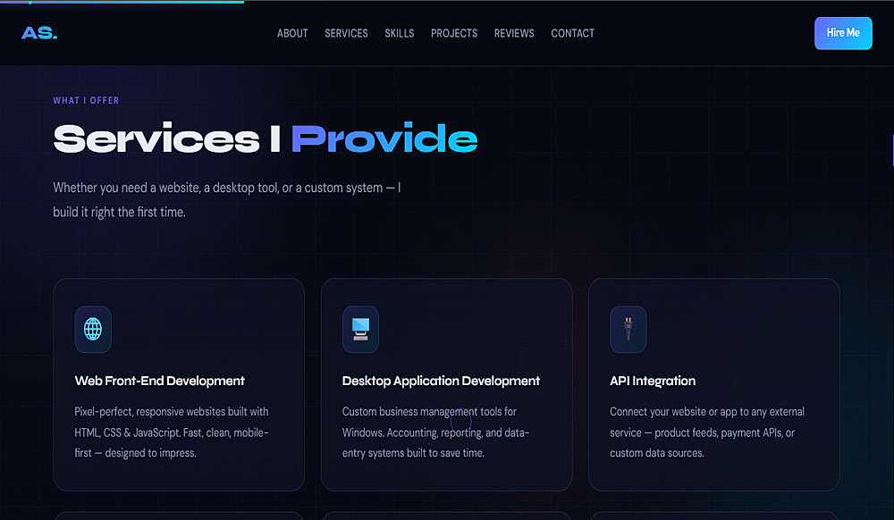 سأقوم بتصميم وتطوير موقع بورتفوليو احترافي وعصري يعرض أعمالك ومهاراتك وخبراتك بطريقة جذابة تعكس هويتك بشكل قوي أمام العملاء وأصحاب الشركات، مما يساعدك على بناء ثقة أكبر وزيادة فرص الحصول على وظائف أو مشاريع جديدة.