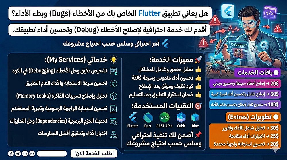 سأقوم بإصلاح الأخطاء (Bugs) وتحسين أداء تطبيقات Flutter