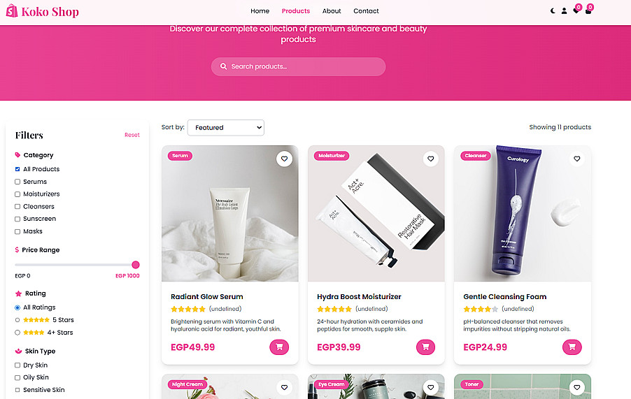 تم بناء موقع إلكتروني متكامل ومتجاوب لعلامة تجارية متخصصة في العناية بالبشرة. يهدف الموقع لتقديم تجربة تسوق فاخرة وسهلة للمستخدم.