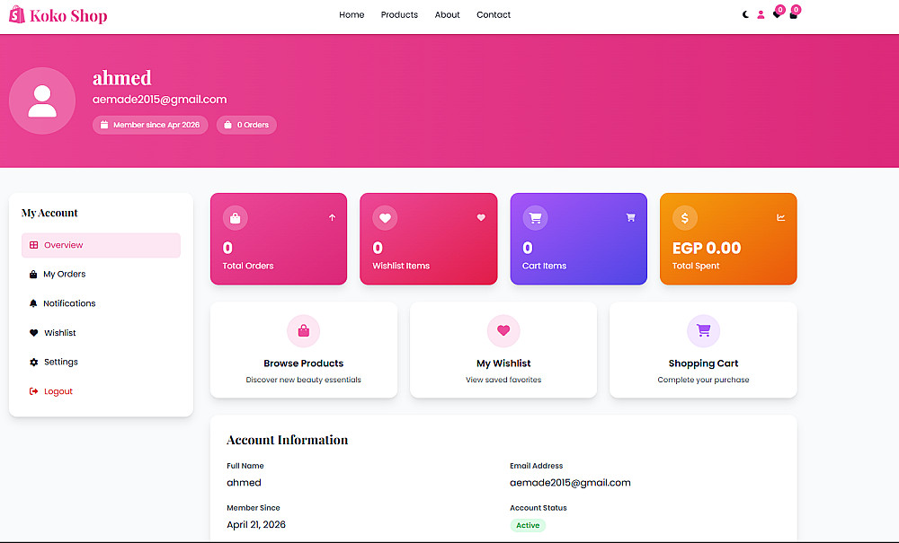 لوحة تحكم عميل شاملة لمتابعة الطلبات والمفضلة.