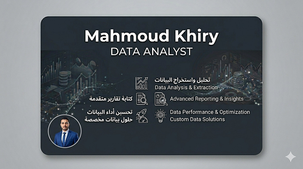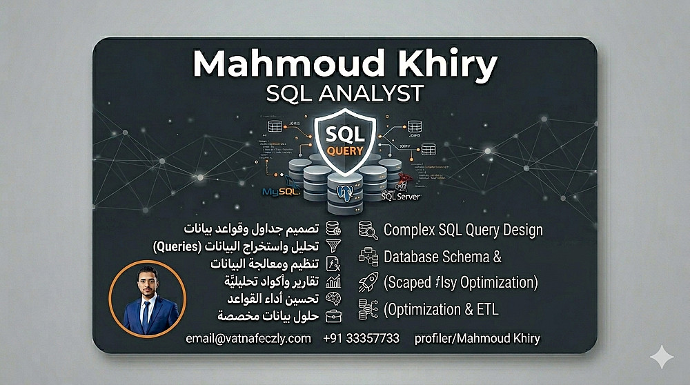 بصفتي محلل بيانات وخبير في لغة SQL، أقدم لك الحلول البرمجية المتكاملة لإدارة واستخلاص البيانات بأعلى كفاءة. سأقوم بكتابة الأكواد اللازمة لتحويل البيانات الخام إلى معلومات قيمة تدعم اتخاذ قراراتك.