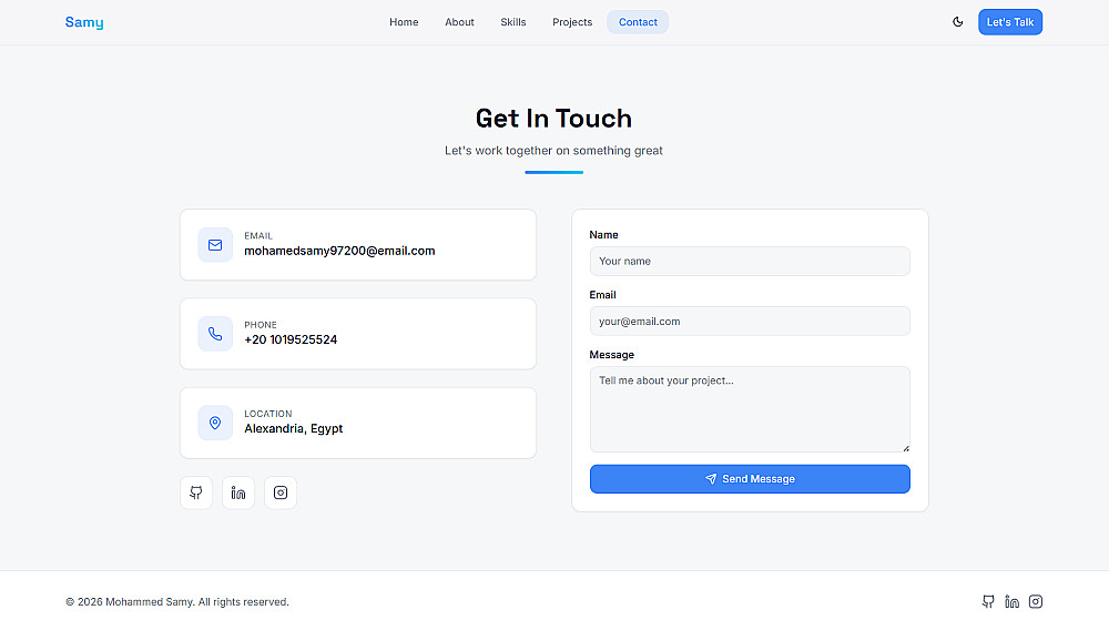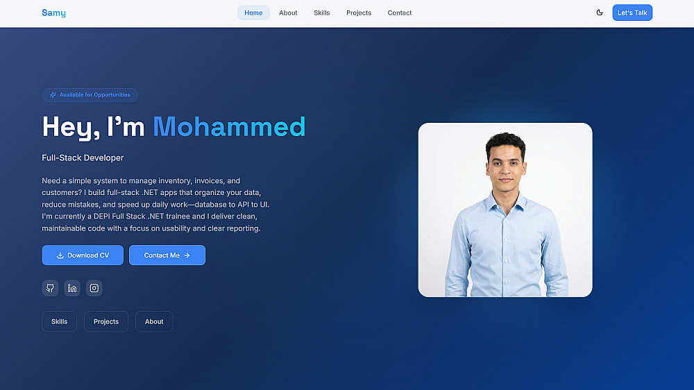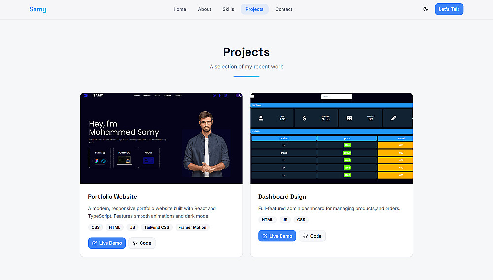 -عرض مشاريع تفاعلي: يتم عرض المشاريع السابقة مع تفاصيل تقنية (مثل لغات البرمجة المستخدمة)، وصور، وروابط معاينة حية (Live Demo) وكود (GitHub).