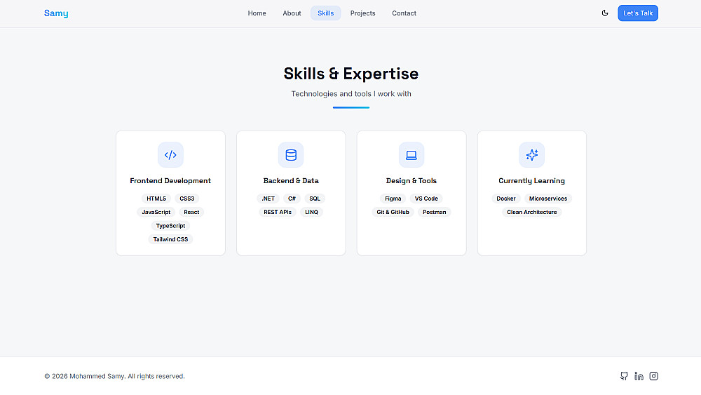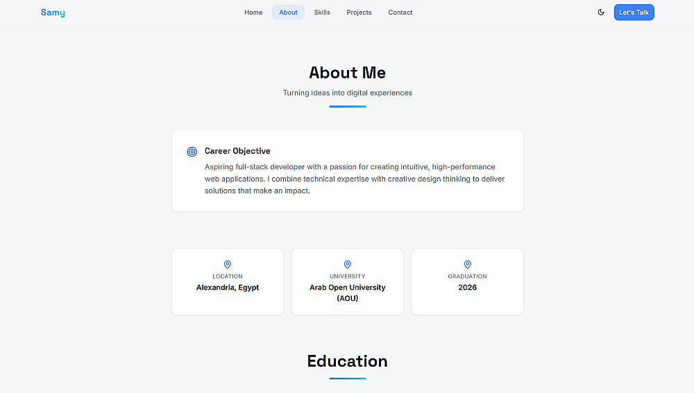 مشروع بناء موقع بورتفوليو شخصي احترافي وعصري لعرض مهاراتي ومشاريعي في مجال تطوير الويب (Full-Stack). تم تصميم وبناء الموقع من الصفر مع التركيز على تجربة مستخدم (UX) ممتازة وواجهة مستخدم (UI) نظيفة وأنيقة.