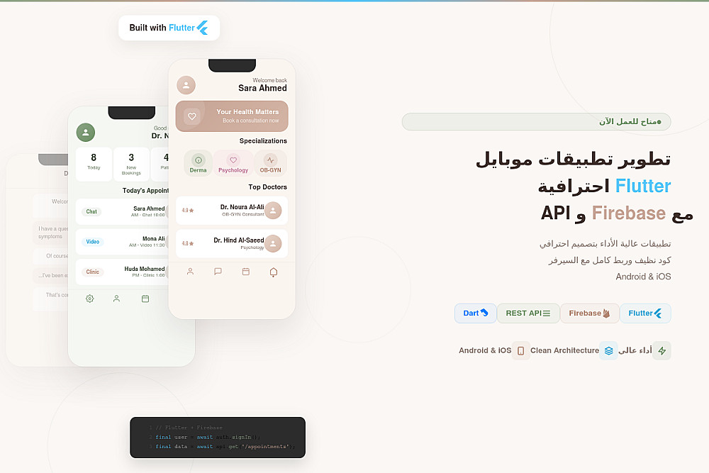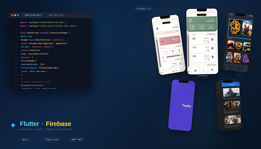 ربط تطبيق Flutter بخدمات Firebase مثل Authentication و Firestore و Notifications.