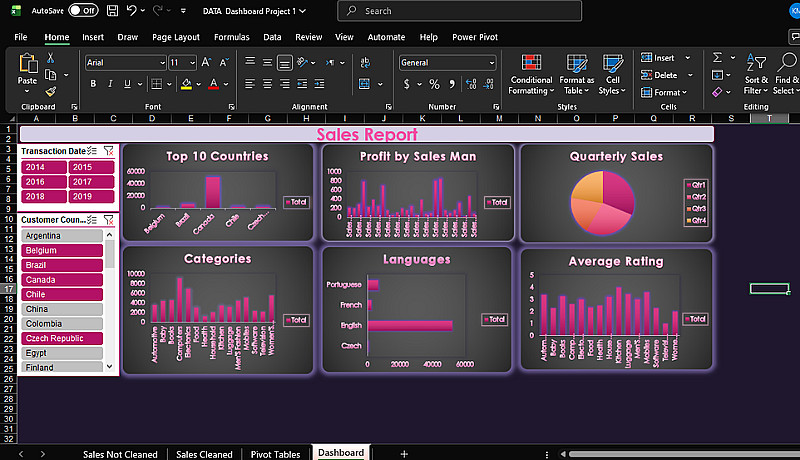 تحليل المبيعات الجغرافية والزمنية: تتبع أداء أفضل 10 دول (مثل كندا، بلجيكا، والبرازيل) ومراقبة النمو الربع سنوي (Quarterly Sales).