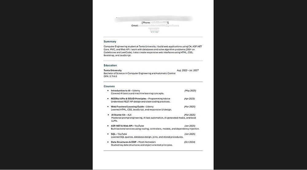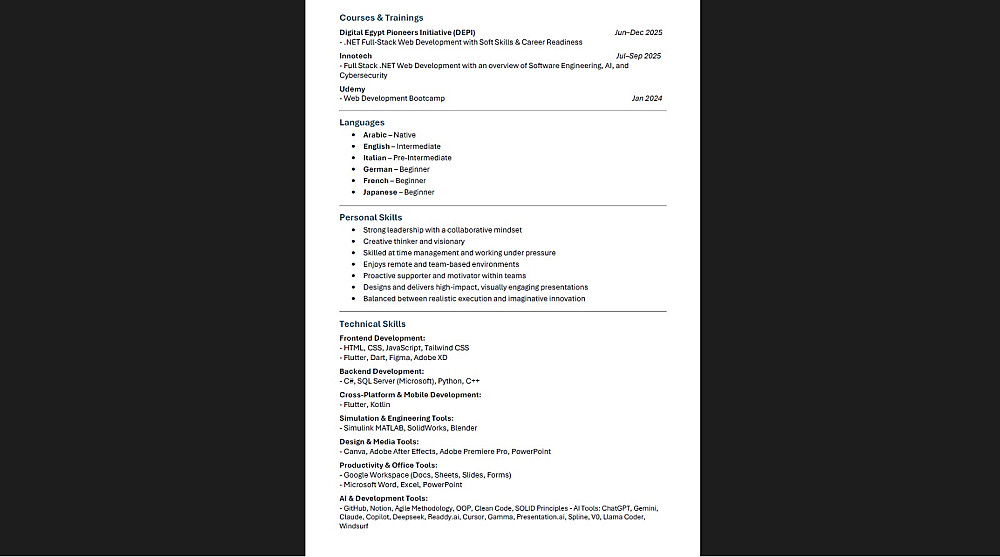 أنا أقدم لك خدمة كتابة وتنسيق CV احترافي متوافق مع ATS، يساعدك على اجتياز الفلترة والوصول للمقابلات