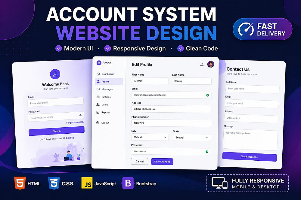تصميم موقع حسابات بسيط (Login + Profile + Forms) باستخدام HTML, CSS, JavaScript