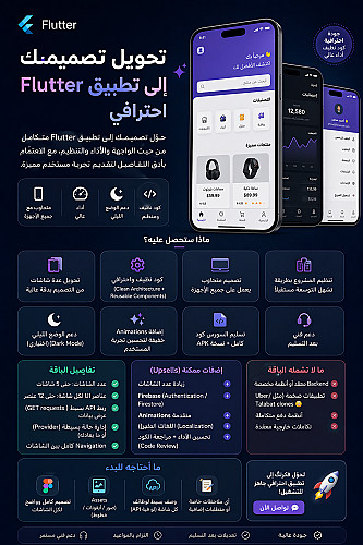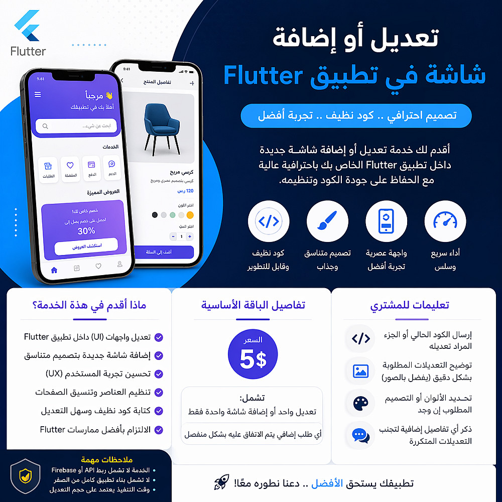 إذا كان لديك تطبيق Flutter وتحتاج إلى تعديل جزء معين أو إضافة شاشة جديدة بشكل احترافي، فأنا أقدم لك خدمة سريعة ودقيقة مع الاهتمام بأدق التفاصيل.